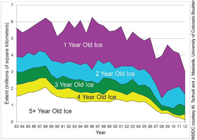 Over the years, the loss of sea ice has become especially manifest in the older ice, as illustrated by the image below.