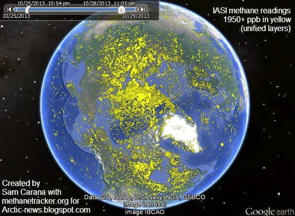 Above image shows the Northern Hemisphere on October 26 - 27, 2013, a period of just over one day. Methane readings of 1950 ppb and higher show up in yellow. Peak reading on October 27, 2013, was 2369 ppb.